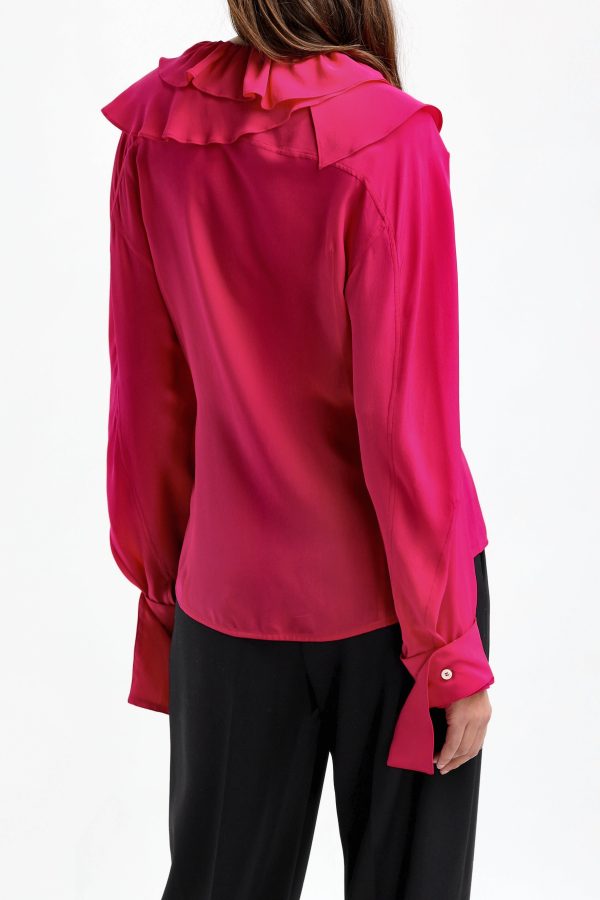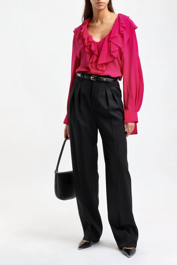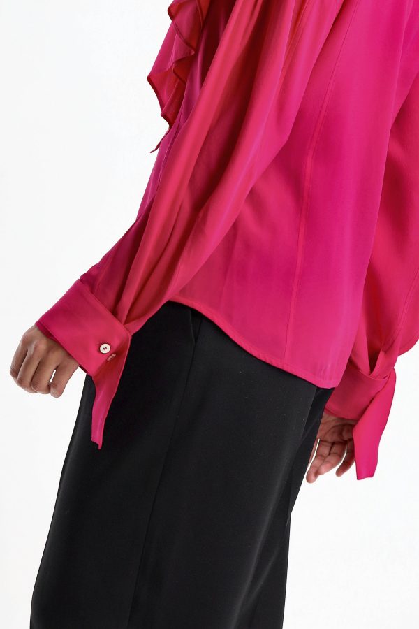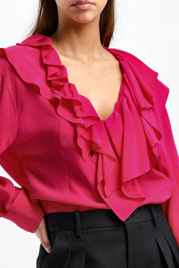 Blouse Deep V Ruffle in Fuchsia V-neck Collar with ruffle trim Cuffs with ribbons Straight hem Care: Dry cleaning Material: 100% silk The model is 1,76 m tall and wears size UK10/S.