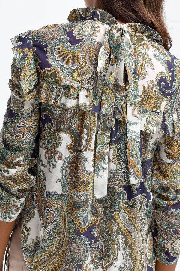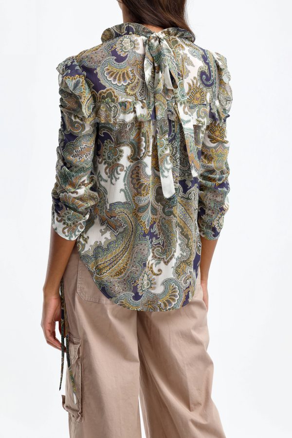 Blouse in Army Multi High collar with ruffles Bow closure Sleeves with ruffles and gathers Sleeves with drawstrings Ruffles at the yoke Paisley pattern Care: Dry cleaning Material: 100% silk The model is 1,75 m tall and wears size US4/S.