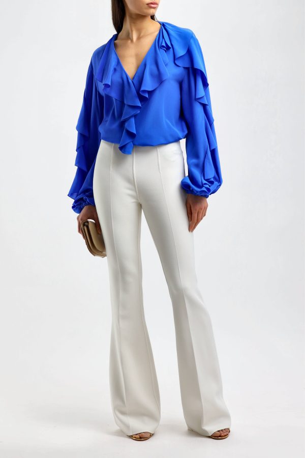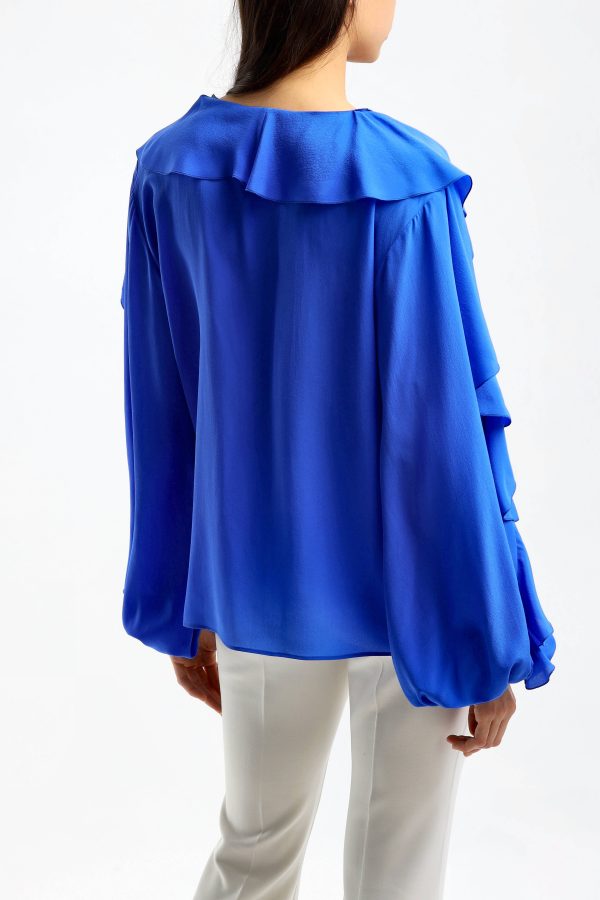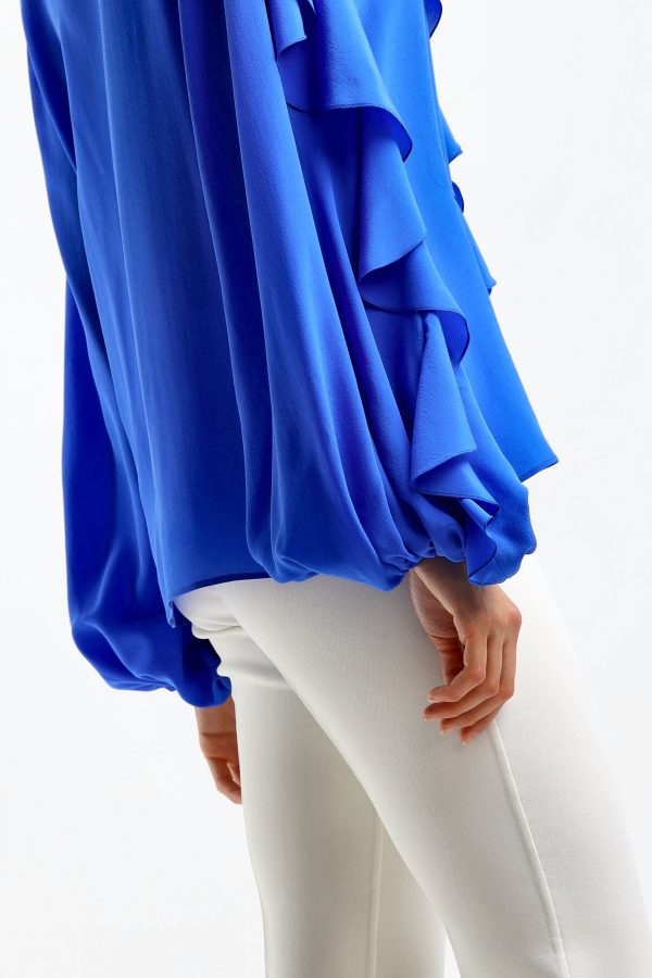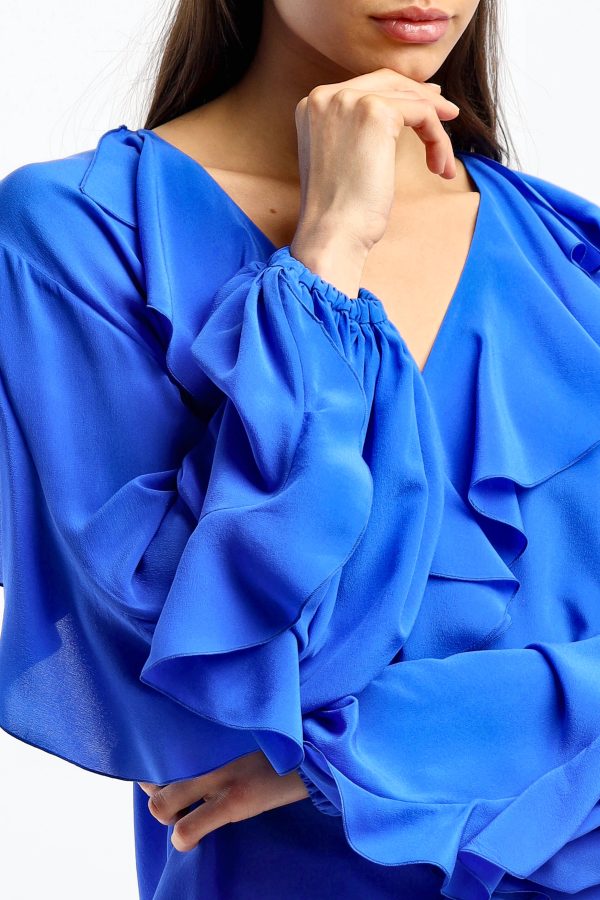Blouse in Shiny Blue V-neck Long sleeves Tight cuffs Ruffles on collar sleeves and front Straight hem Care: Dry cleaning Material: 100% silk